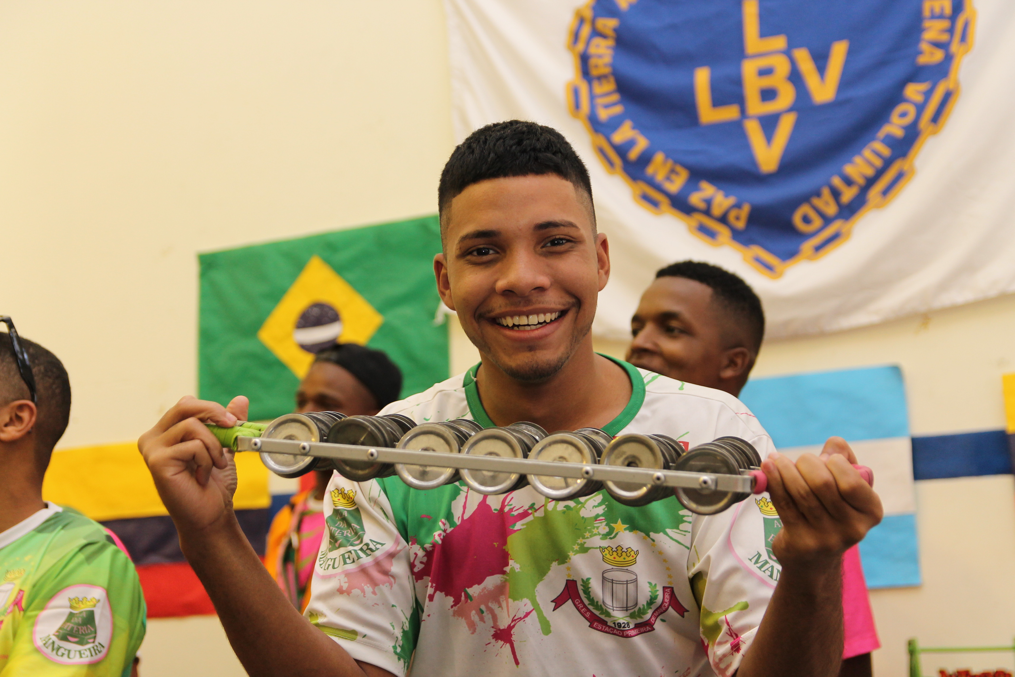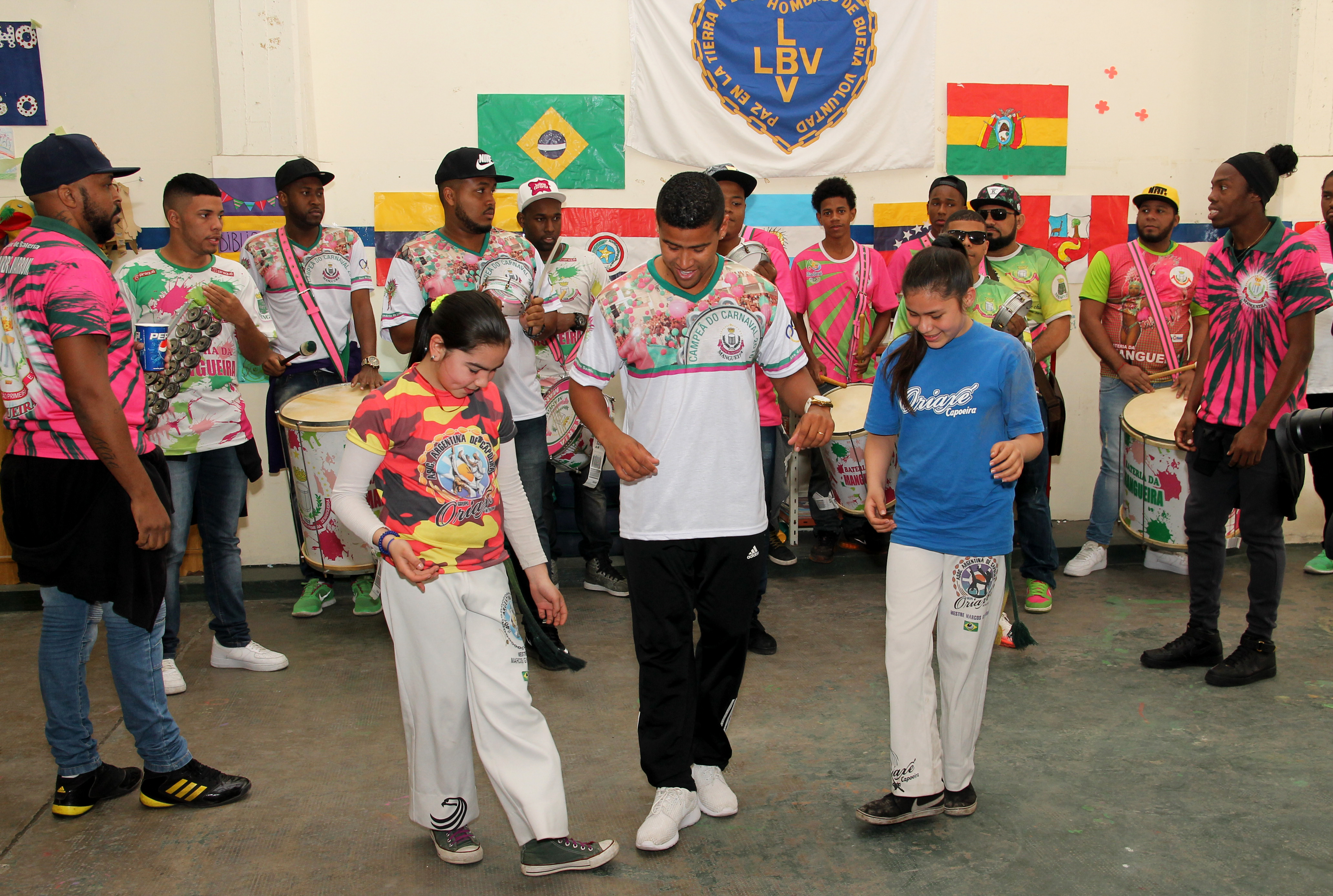 Sábado a la mañana. Los niños y niñas que asisten durante el año al Taller de Capoeira del Espacio Educativo Calle Colores, llegaron temprano a la sede situada en Iguazú 1457, del humilde barrio Zavaleta. Unos minutos más tarde, sus rostros observaban asombrados y admirados a los integrantes de la Escola de Samba Estação Primeira de Mangueira, de Rio de Janeiro, venidos directo desde su Brasil natal. Las remeras rosas que identificaban al grupo carioca y los llamativos instrumentos, invitaban a curiosear…